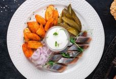 100/120/90 г • Селедка с/с, картофельные дольки, лук маринованный, огурец, сметана