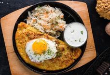 400/50 г • Драники, куриное филе, лук, сыр, огурец маринованный, яйцо, сметана, капуста квашеная